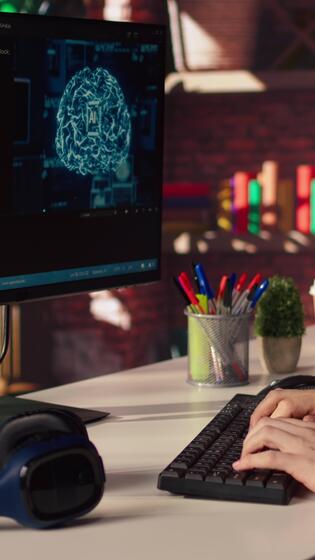 Freelancing computer engineer doing maintenance on artificial intelligence systems, closeup. Remote tech support specialist at working from home, doing checkup on AI systems, camera A Pro Video