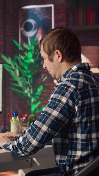 Man in home office stretches back while looking at UI on PC screen, feeling fatigued while executing programming code. IT developer feeling backpain, relieving pain, writing and testing code, camera A Pro Video
