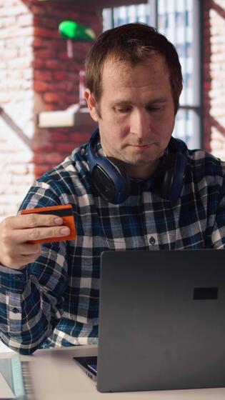 Happy man excited to do online shopping, typing debit card information on laptop in apartment. Cheerful person at desk using notebook, adding payment method on website, camera A Pro Video