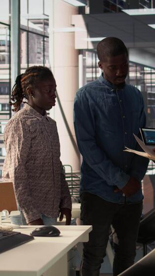 Vertical Professional team analyzing archived data on a financial file during meeting, collaborating on enterprise solutions and solving tasks to improve performance for long term growth. Camera B. Pro Video