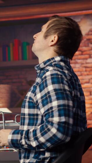 AI engineer in home office stretching back while looking at PC screen, feeling fatigued while executing code. Artificial intelligence developer feeling backpain, relieving pain, testing code, camera B Pro Video