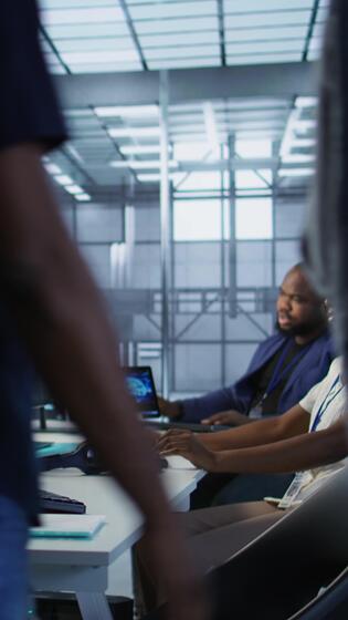 Vertical Technician entering data center, tuning music on and starting work on AI predictive maintenance systems. Server hub staff member using artificial intelligence to identify hardware failures, camera A Pro Video