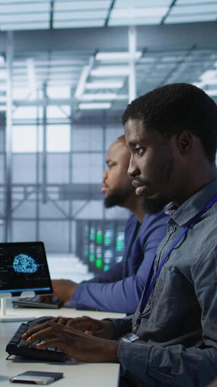 Vertical Cheerful server room workers laughing together in office while ensuring minimal downtime. Jolly engineers having fun in data center, using data analytics to monitor performance, camera A Pro Video