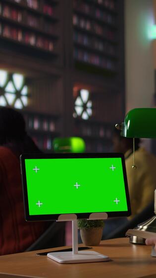 Vertical Primary school student sitting at desk in the library and reading next to mockup on tablet, preparing notes and ideas for future lessons. Scholar girl using digital gadget for assignments. Camera A. Pro Video