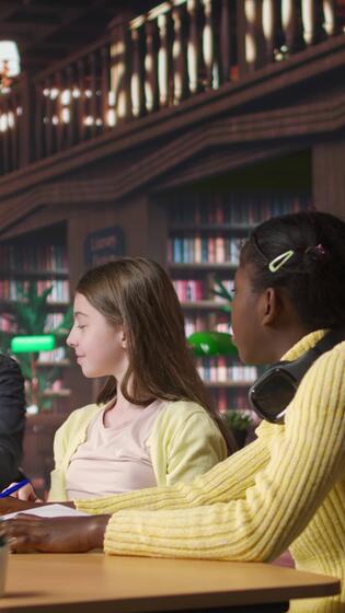 Vertical Elementary school pupils working with a professor solving exercises for the class homework, developing learning skills at a study desk. Tutor explains the curriculum materials to girls. Camera A. Pro Video