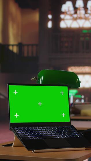 Vertical Focused schoolgirl engaged in academic tasks with green screen at a library, working on school assignments with her laptop. Solving class work tasks, searches information on internet. Camera A. Pro Video