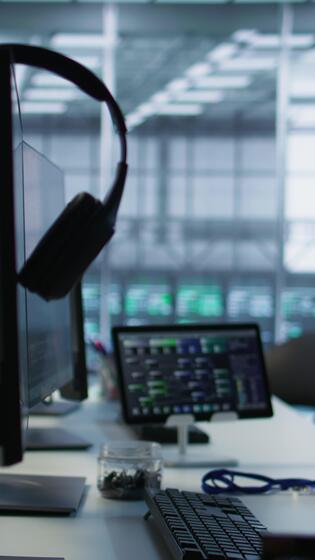 Vertical Close up of computer peripherals on server room desk used by employees working to ensure minimal downtime. Hard disk, keyboard and tablet in data center office used for monitoring performance Pro Video