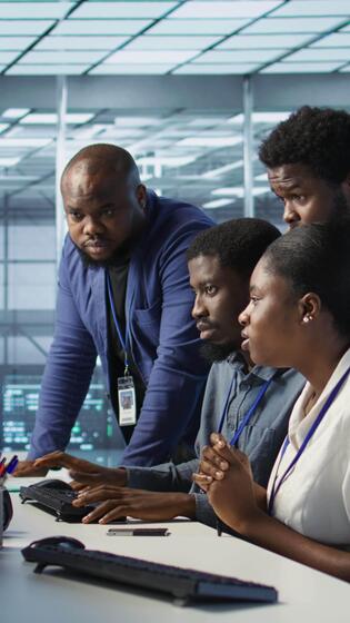 Vertical Teamworking engineers talking in server room, developing disaster recovery plans ensuring minimal downtime. Team of data center employees doing brainstorming, monitoring performance, camera A Pro Video
