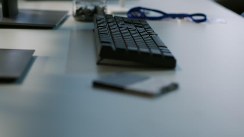 Close up of computer peripherals on server room desk used by employees working to ensure minimal downtime. Hard disk, keyboard and tablet in data center office used for monitoring performance Pro Video