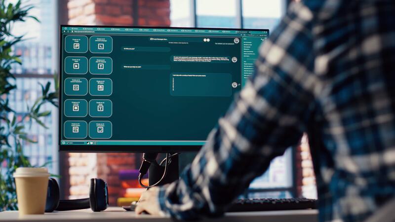 Man at home asking questions to AI LLM chatbot virtual assistant answering user prompts. Person receiving helpful information from artificial intelligence large language model program on PC, camera B Pro Video