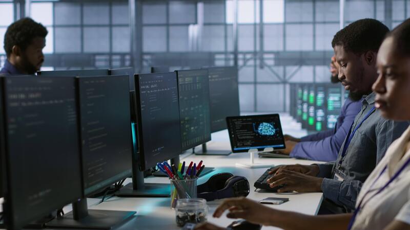 Computer scientists in data center implementing AI predictive maintenance systems. Server farm employees using artificial intelligence to identify hardware failures impacting operations, camera A Pro Video