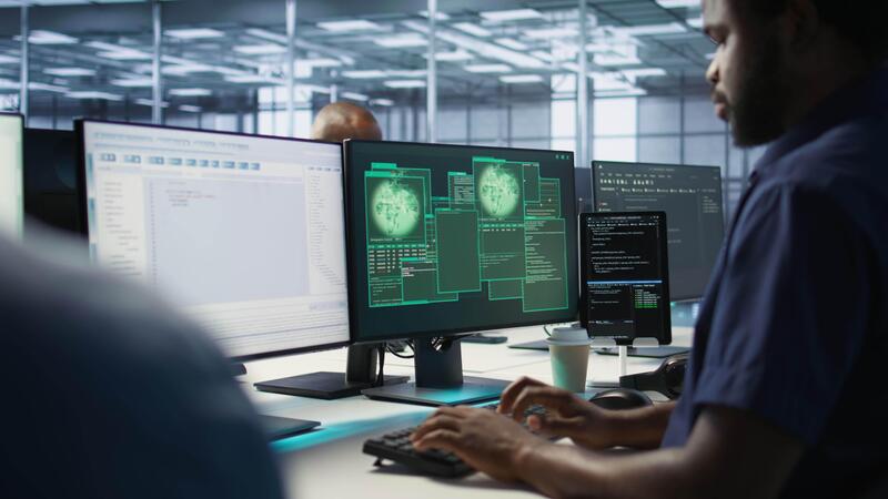 Cybersecurity division workers in server room protecting equipment from hacker stealing data. Data center IT specialists struggling to delete virus attacking company servers, doing brainstorming Pro Video
