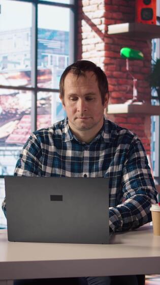 Man seated at home office desk using laptop, answering phone call while checking emails displayed on screen. Worker in telephone call with friend at work while reading messages in inbox, camera A Pro Video