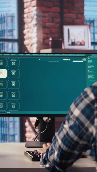 Man in home office using generative artificial intelligence website generating videos using diffusion models. Person wearing headphones using AI virtual assistant producing clips for him, camera A Pro Video