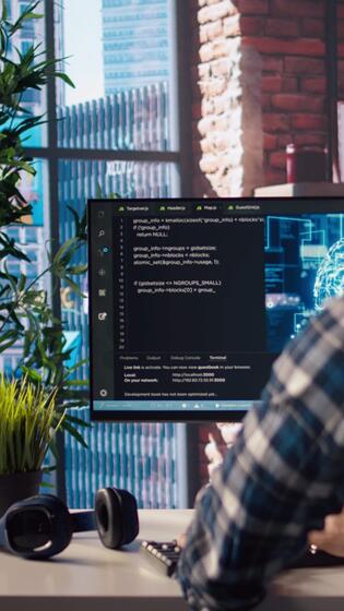 Developer writing code on computer and doing maintenance on artificial intelligence neural networks computerized model. Tech support expert typing on keyboard, doing checkup on AI systems, camera A Pro Video