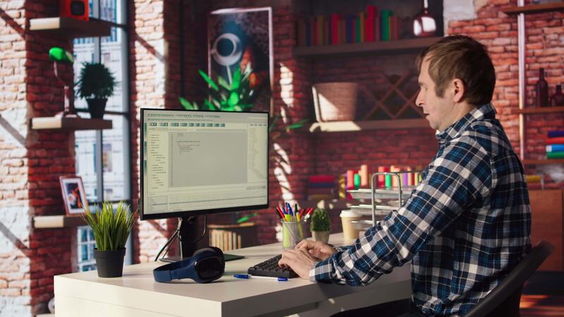 Coder at workstation programming on PC, writing lines of code, using development tools, feeling stressed. Man in home office having deadline, stressed to finish debugging software, camera A Pro Video