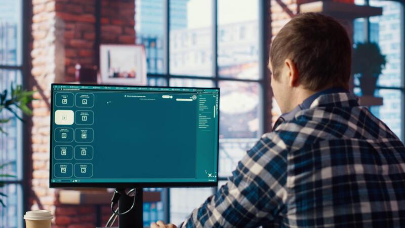 Man in home office using generative artificial intelligence website generating videos using diffusion models. Person wearing headphones using AI virtual assistant producing clips for him, camera B Pro Video