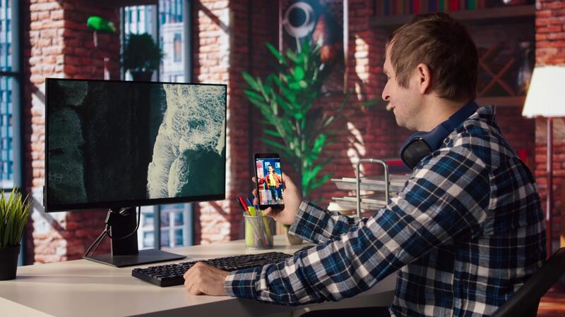 Man in workspace watching videos on social media on smartphone. Person using social network app on mobile phone with computer monitor idle in front of him showing screensaver, camera A Pro Video