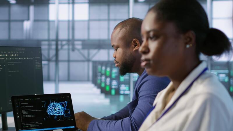 System administrators in data center implementing AI systems. Server farm specialists using artificial intelligence to identify hardware failures impacting operations, camera A handheld camera shot Pro Video