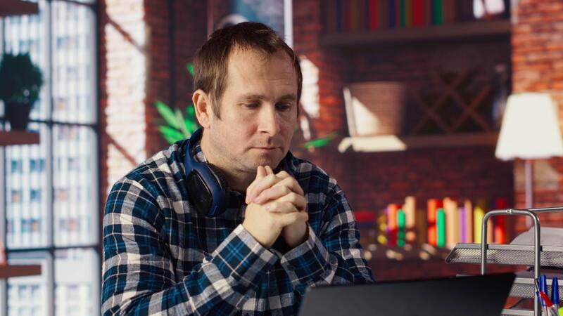 Man relaxing in apartment, texting friends on laptop, enjoying leisure time. Smiling remote worker taking break to talk with mates on social media website, using notebook, camera B Pro Video