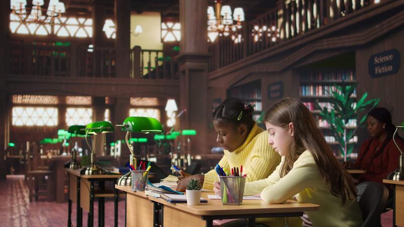 Diverse classmates scholars doing their class homework together in the library, working hard to obtain good grades. Focused schoolgirls solving their assignments with academic materials. Camera A. Pro Video