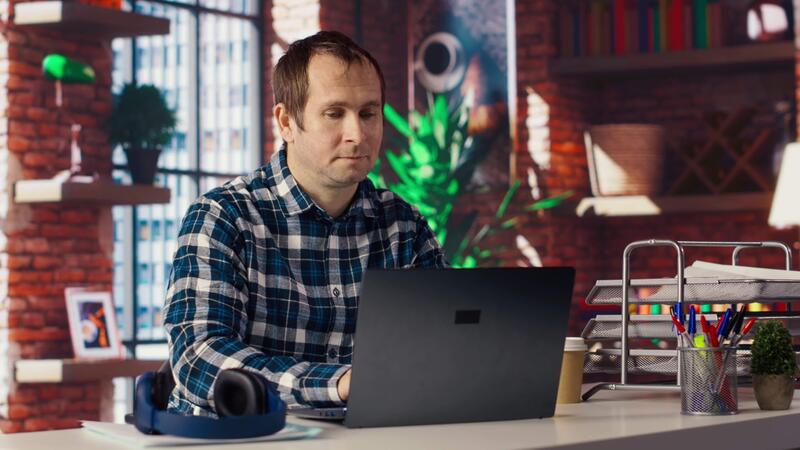 Man seated at home office desk using laptop, answering phone call while checking emails displayed on screen. Worker in telephone call with friend at work while reading messages in inbox, camera B Pro Video