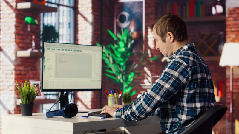 Software developer at computer coding, stretching joints after sitting at desk too long. IT expert in home office doing muscle exercises after feeling pain from incorrect posture, camera B Pro Video