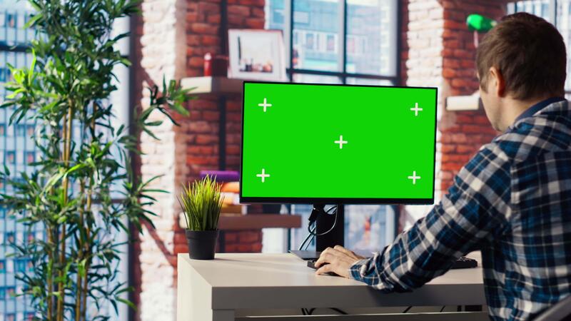 Teleworking man in living room home office using chroma key computer to plan business development. Remote worker doing project research, typing on green screen device keyboard, camera B Pro Video