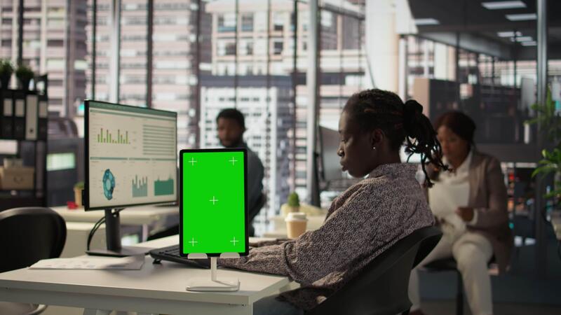 Female manager seated at workstation with green screen on devices, working on solving administrative tasks for enterprise growth. Developing performance metrics to support firm goals. Camera B. Pro Video