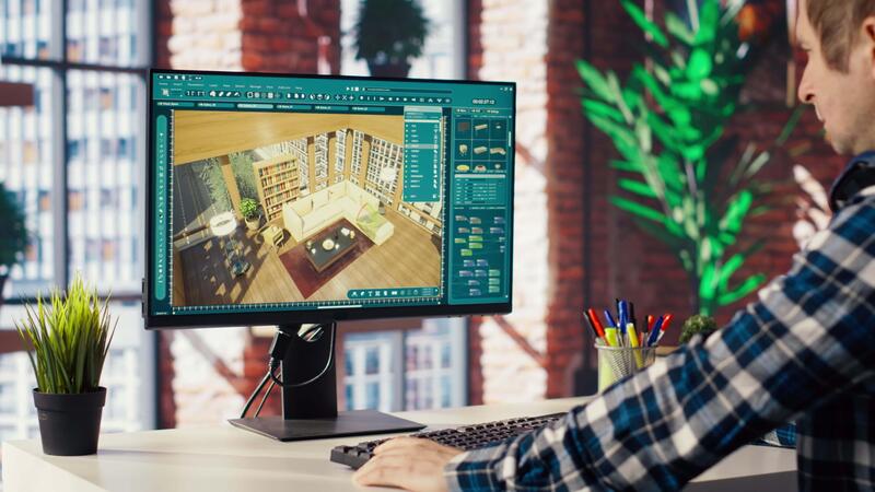 Assets being moved in 3D modeling program by architectural designer in rendered apartment for interior design project. CAD software used for making home floor plans and virtual furniture, camera B Pro Video