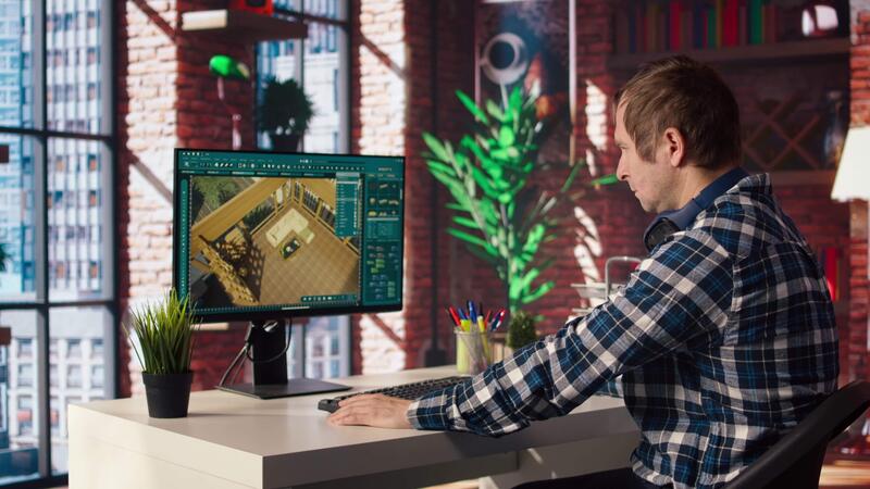 Freelancer working from home moving assets in 3D modeling program, doing interior design project. Teleworking interior designer using CAD software on PC, making home floor plans, camera A Pro Video