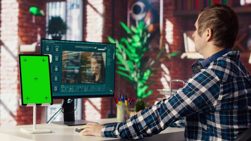 Man watching guide on mockup device about generative artificial intelligence generating videos. Man looks at tutorial on green screen tablet about AI virtual assistant producing clips, camera B Pro Video