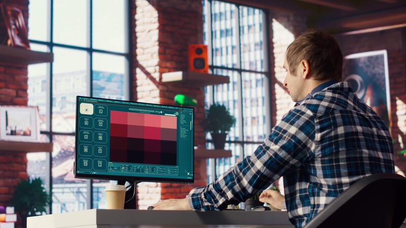 Man in apartment workspace using AI software turning text prompt into photos. Person in brick wall home uses text to image artificial intelligence generative models on computer, camera B Pro Video
