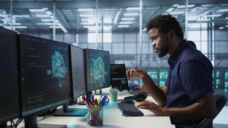 Engineer in data center implementing advanced AI driven predictive maintenance systems to proactively identify and resolve potential hardware failures before they impact operations, camera A Pro Video