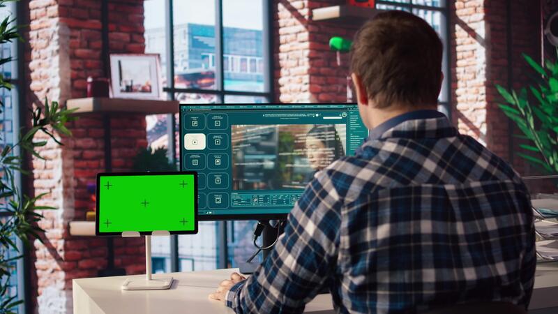 Man in home office uses AI program turning text prompt into videos next to isolated screen tablet. Person using text to generative models on computer and chroma key device, camera A Pro Video