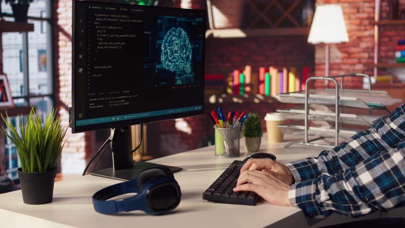 Freelancing computer engineer doing maintenance on artificial intelligence systems, closeup. Remote tech support specialist at working from home, doing checkup on AI systems, camera A Pro Video