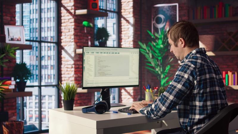 Man in home office stretches back while looking at UI on PC screen, feeling fatigued while executing programming code. IT developer feeling backpain, relieving pain, writing and testing code, camera A Pro Video