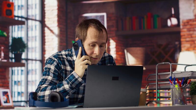 Manager in home office sitting at desk in front of laptop, calling employee to confront him about mistakes. Supervisor using notebook to do job online, doing telephone call to scold worker, camera B Pro Video