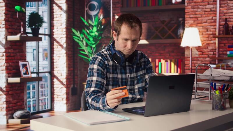 Man has difficulties while internet shopping, receiving errors after typing credit card information on laptop. Frustrated shopper sees insufficient funds popup after adding payment method, camera A Pro Video