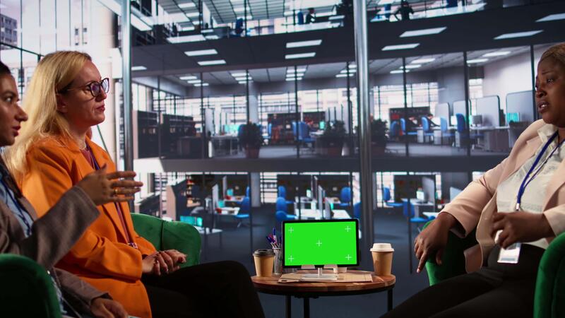 Multiethnic team of experts sharing insight next to chroma key screen, evaluating the performance metrics of the company and the staff. Female leaders analyzing data infographics. Camera B. Pro Video