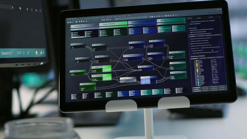 Close up of tablet in high tech data center business used for maintaining network gear. Focus on programming app on device in server farm used to ensure optimal system performance Pro Video