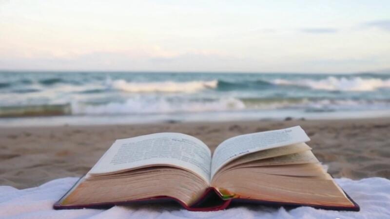 A Serene Beach Scene with a Book Lying Open on a Towel, Waves Crashing Softly in the Background Free Video