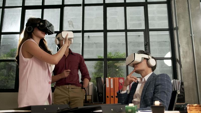 Multiracial workers use VR headset simulator equipment to visualization 3D cyberspace, view and interactive touch, futuristic digital workspace at the office, gadget device, exciting experience. Free Video