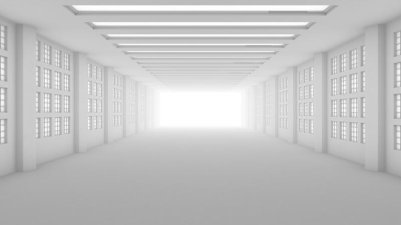Long empty tunnel corridor with white windows on both sides. Loop sequence. 3D Animation Free Video
