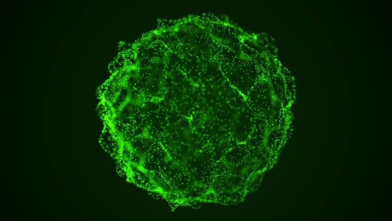 Green glowing particle sphere with fluid dynamic motion on a dark background Pro Video