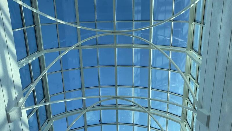 This stunning image features a magnificent glass ceiling, offering a view of the blue sky with clouds, enhancing the elegance and sophistication of any interior while creating serenity Pro Video