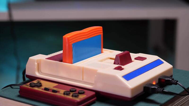 Person inserting cartridge into retro game console. Retro game console with cartridge Pro Video