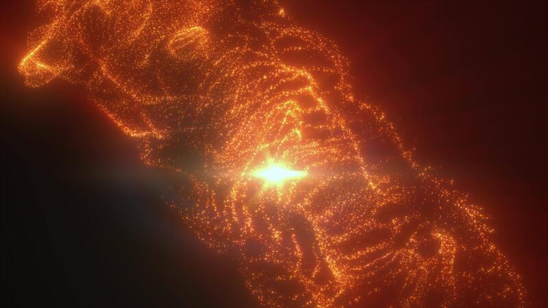 A striking abstract visual of flowing orange and red particles forming a fiery energetic pattern illuminating a dark background with warmth and intensity Pro Video