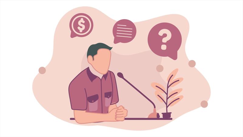 Animation of leader who was speaking in front of the microphone, expressed a good statement. Loop playback on 4K footage. Flat design style Pro Video