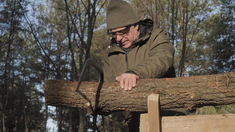 An elderly man in warm clothing meticulously works with a log, preparing it for use, in a peaceful forest setting surrounded by tall trees and natural light. Pro Video